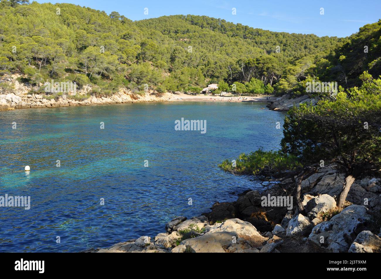 Calanque de Port d'Alon. Plage de galets éloignée de l'agglomération et appréciée des familles. Point de départ pour le sentier du littoral. Située entre Saint-Cyr et Bandol, la calanque de port d'Alon à l'allure sauvage est une escale de verdure et de fraîcheur idéale pour les amoureux de la nature.