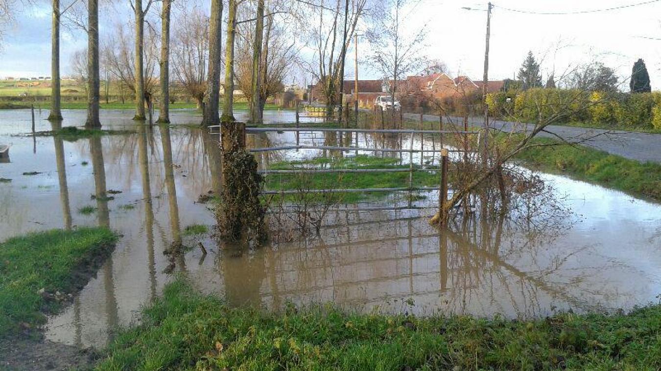 Suite aux pluies de cette nuit et d'aujourd'hui, les cours d'eau débordent de nouveau dans le hameau de Saint-Quentin à Aire-sur-la-Lys, et entre Aire et Witternesse.