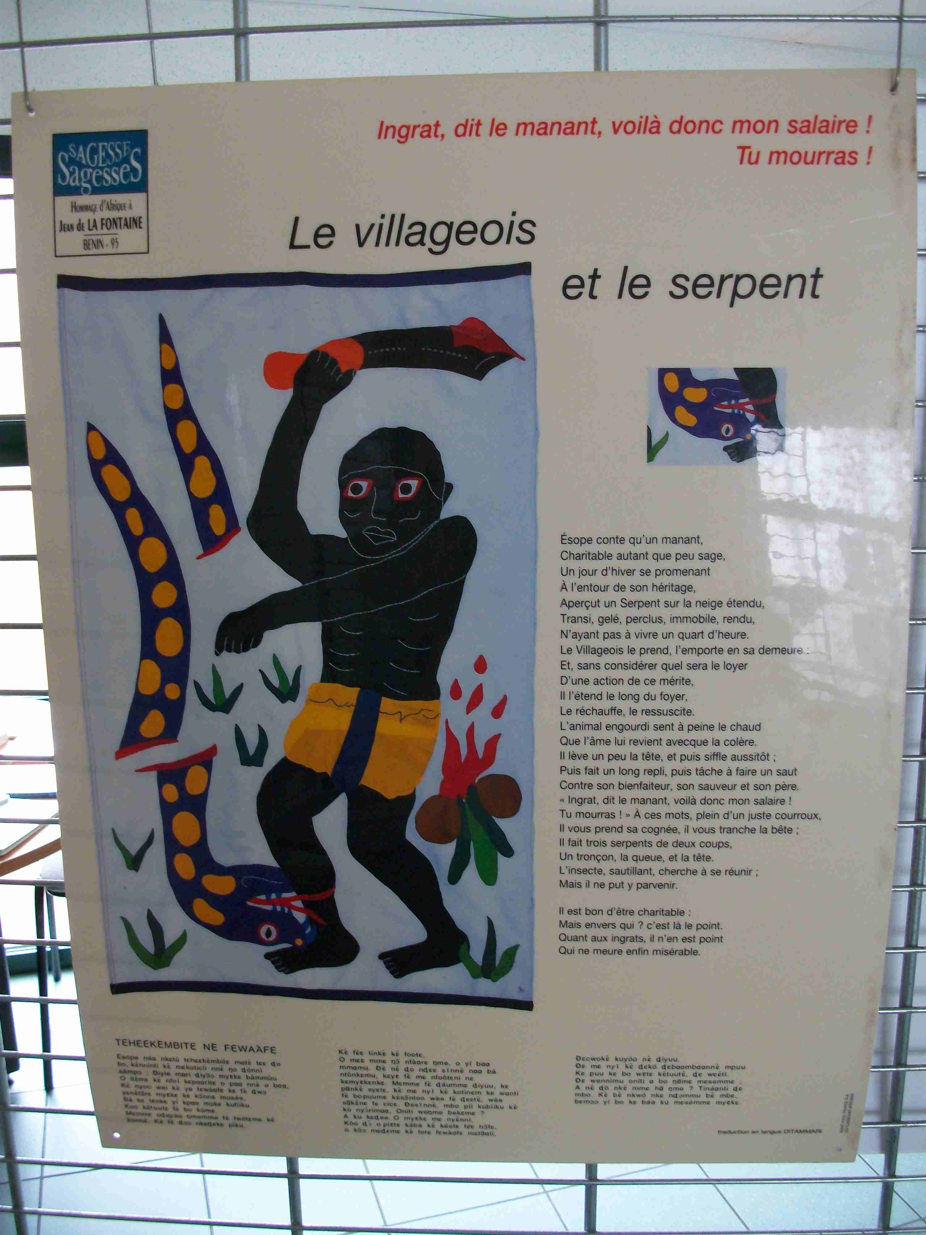 Le Villageois et le serpent, La Fontaine. Esope conte qu'un manant, Charitable autant que peu sage, Un jour d'hiver se promenant. A l'entour de son héritage, Aperçut un serpent sur la neige étendu, Transi, gelé, perclus, immobile rendu, N'ayant pas à vivre un quart d'heure. Le villageois le prend, l'emporte en sa demeure;