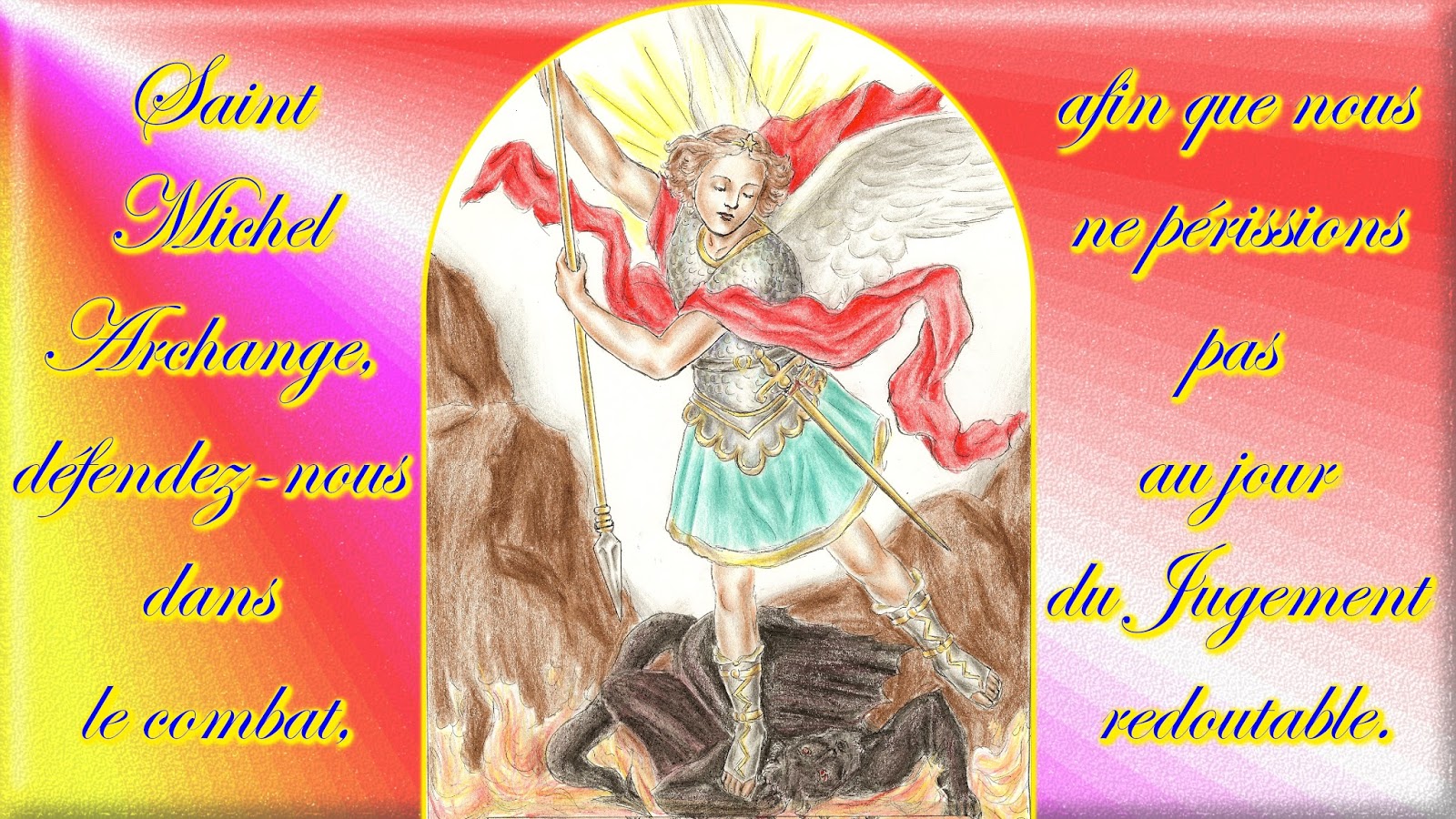 Saint Michel Archange, défendez-nous dans le combat ; soyez notre secours contre la malice et les embûches du démon. Que Dieu lui fasse sentir son empire, nous vous en supplions. Et vous, Prince de la Milice céleste, repoussez en enfer, par la force divine, Satan et les autres esprits mauvais qui rôdent dans le monde. en vue de perdre les.