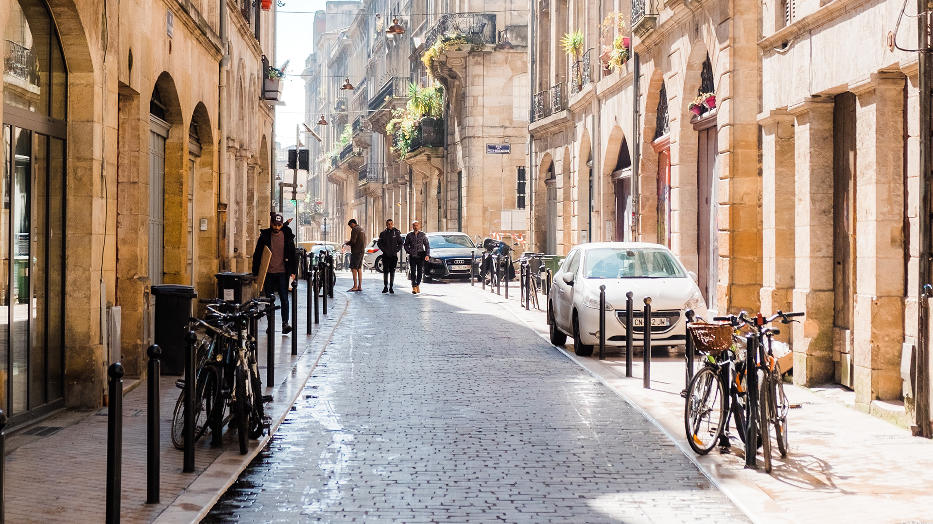 A Bordeaux street scene just before noon, after a rainfall. Rue Bonnac, Bordeaux, France